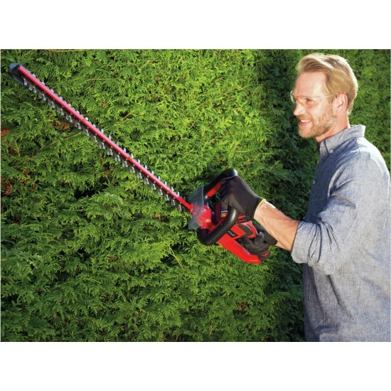 Die Einhell Akku-Heckenschere GE-CH 18/60 Li-Solo ist ein leistungsstarkes Mitglied der Power X-Change-Familie von Einhell. Die Messer aus lasergeschnittenem und diamantgeschliffenem Stahl sind auf maximale Präzision und Langlebigkeit ausgelegt. Der Griff ist drehbar, der ergonomische, schmale Frontgriff ist mit Mikro-Schalter ausgestattet. Das Metallgetriebe sorgt für eine lange Lebenszeit. Die Alu-Messerabdeckung sichert die Messer und der stabile Köcher schützt bei Lagerung und Transport. In der Lieferung inklusive ist ein Stoßschutz mit einer Halterung für die Wandmontage und ein Schnittgutsammler. Für den Betrieb ist ein 18 Volt Power X-Change-Akku notwendig.