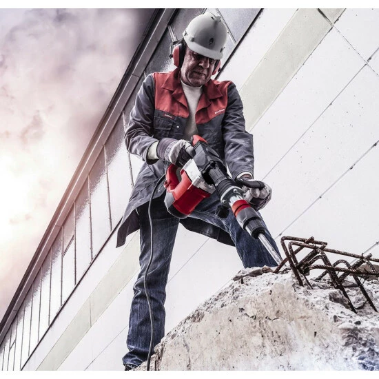 Der Abbruchhammer TE-DH 1027 von Einhell, dessen kraftvoller 1500-Watt-Motor den Meißel mit 32 Joule Schlagkraft vorantreibt, eignet sich ideal für schwere Abbrucharbeiten rund um Haus, Garage und Werkstatt. Das Gerät verfügt über eine SDS-Max-Werkzeugaufnahme, die den schnellen und werkzeuglosen Meißelwechsel ermöglicht. Zusätzlich entstehende Vibrationen werden durch den schwingungsgedämpften Hauptgriff und die Softgriffeinlagen gedämpft. Der präzise einstellbare und ergonomische Zusatzhandgriff bietet dank Softgriff ebenso jederzeit sicheren Halt. Die robuste und langlebige Konstruktion des Stemmhammers und das extra lange und robuste Gummikabel sind bestens für den harten Dauerbetrieb geeignet. Die automatisch abschaltenden Kohlebürsten verhindern dabei zuverlässig einen Geräte. Ein Aufbewahrungskoffer für einen leichten Transport ist im Lieferumfang enthalten.