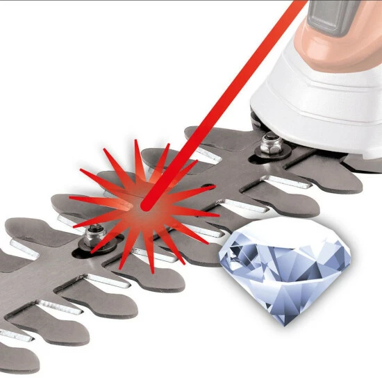 Die akkubetriebene Gras- und Strauchschere GE-CG 12 Li ist ein hochwertiges, praktisches Gerät, mit der die Pflege von Rasenkanten, Büschen und Sträuchern spielend leicht von der Hand geht. Ihr bequem mit einer Hand bedienbarer Sicherheitsschalter am Handgriff verhindert unbeabsichtigtes Einschalten. Für optimale Kraftübertragung sorgt ein robustes Metall-Getriebe. Die hochwertigen, langlebigen Messer der GE-CG 12 Li sind lasergeschnitten, erzielen sehr gute Schnittresultate und lassen sich mit wenigen Handgriffen werkzeuglos wechseln. Das Gerät ist mit einem Grasschneideblatt und einem Strauchscherenmesser ausgestattet. Dank Teleskopstiel mit großen Laufrädern lässt sich die Grasschere mühelos und in aufrechter Körperhaltung führen. Dank Softgrip liegt sie angenehm griffig in der Hand.