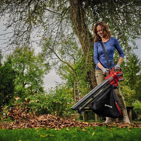 - Integrierter Häcksler: Die Häckselfunktion zerkleinert das aufgesaugte Laub auf ein Zehntel des ursprünglichen Volumens, bevor es im Fangsack landet.