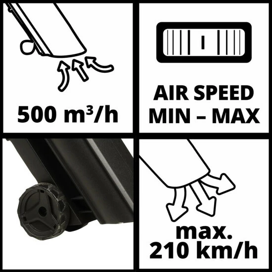 - Regulierbare Drehzahl: Mit der Drehzahlregulierung kann die Saug- bzw. Blasleistung immer auf den Anwendungsort und Untergrund angepasst werden.