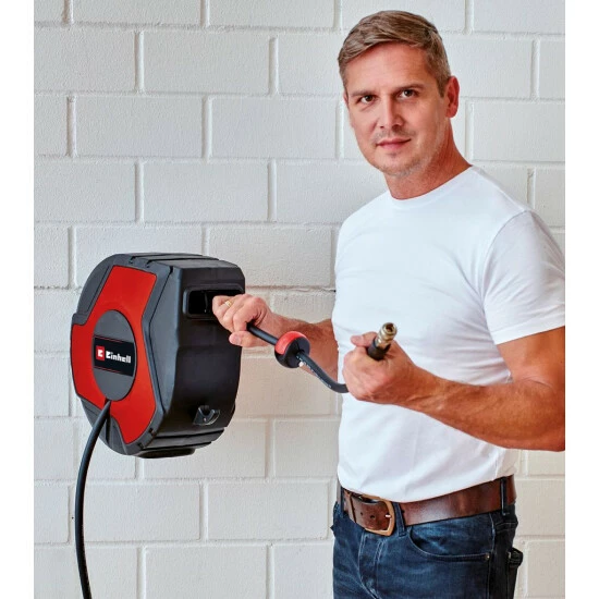 Die Einhell Druckluft-Schlauchtrommel TC-PH 150 ist stets griff- und einsatzbereit bei allen Arbeiten in Heim, Werkstatt und Garage. Dabei ist der Schlauch im Handumdrehen auch wieder schnell und sicher verstaut, vermeidet Stolperfallen und Unfallgefahren. Die Schlauchtrommel besteht aus einem 15 Meter Druckluft- & 1,5 Meter Anschlussschlauch (je 9mm Innendurchmesser). Der max. Arbeitsdruck beträgt 16 bar. Beide Schläuche bestehen aus einer PVC-Gummi-Mischung. Dieses Material macht die Schläuche flexibel und knickfest. Dank automatischer Rasterung ist zugentlastetes Arbeiten möglich. Die sichere Schlauchaufrollung erfolgt dank automatischem Langsam-Einzug. Die lagengespulte Aufwicklung verhindert ein Blockieren des Schlauchs. Der Haken am Gehäuse ermöglicht das Anbringen einer Ausblaspistole. Inklusive ist auch die um 170° schwenkbare Wandhalterung für flexiblen Einsatzbereich. Montagezubehör für die Wandhalterung wird mitgeliefert.