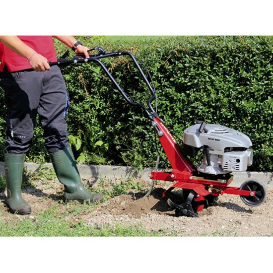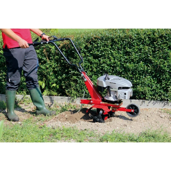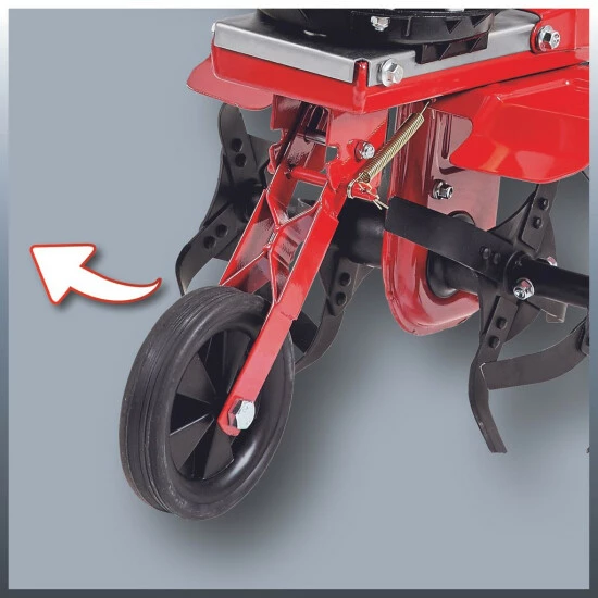 Mit der Benzin-Bodenhacke GC-MT 3036 erhalten ambitionierte Heimwerker ein praktisches, kraftvolles Gartenwerkzeug für die hocheffektive Bodenbearbeitung. Der Einzylinder-Viertaktmotor mit beidseitig gelagerter Kurbelwelle sorgt für starke Arbeitsleistung und ruhigen Lauf. Der höhenverstellbare Bremssporn der GC-MT 3036 ermöglicht das einfache Einstellen der Arbeitstiefe. Zur sicheren Bedienung ist das Gerät mit einem Hackmesserstop ausgerüstet – sobald der Schalter losgelassen wird, setzt eine Totmann-Schaltung die Messer außer Betrieb. Das schwenkbare Führungsrad sorgt für bequemen und mühelos en Standortwechsel. Dank ergonomischer, höhenverstellbarer Führungsgriffe lässt sich die Bodenhacke optimal an die Körpergröße anpassen.