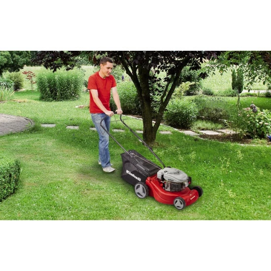 Der Einhell Benzin-Rasenmäher GC-PM 40 S-P ist ein kraftvoller Rasenmäher, empfohlen für eine Rasenfläche bis 1000 Quadratmeter. Der luftgekühlte Ein-Zylinder-Vier-Takt-OHV-Motor von Einhell bringt eine enorme Kraft auf, große und intensiv bewachsene Flächen in den Griff zu bekommen. Durch den zu- und abschaltbaren Hinterradantrieb kann der Anwender selbst entscheiden, wann und ob die zusätzliche Kraft des Hinterradantriebs wird. Als „Highwheeler“ mit kugelgelagerten Antriebsrädern arbeitet sich der Benzinrasenmäher mit dem nötigen Biss durch starken Bewuchs und unwegsames Gelände. Die Räder des „Highwheelers“ sind größer als bei üblichen Rasenmähern – das birgt den Vorteil, dass der Benzinrasenmäher auch bei dichtem Bewuchs, höherem Gras und in Wiesen besser voran kommt. Die vergrößerten Räder laufen leichter über Unebenheiten, so dass effizienter gemäht werden kann. Verwilderte Flächen können mit dem GC-PM 40 S-P unproblematisch wieder unter Kontrolle gebracht werden. Der Benzin-Rasenmäher von Einhell verfügt über eine fünfstufige zentrale Schnitthöhenverstellung von 25 bis 60 Millimeter. Mit dem ergonomischen, klappbaren Führungsholm gestaltet sich das Arbeiten angenehmer durch eine der menschlichen Haltung entsprechend angepassten Form. Ein extrahoher Auswurfkanal sorgt für außergewöhnlich gutes Fangverhalten, der große Grasfangkorb verfügt über eine Füllstandsanzeige und zwei Griffe zum einfachen Entleeren. Das formschöne und stabile Kunststoffgehäuse ist mit agiler Wendigkeit einfach zu handhaben und besticht durch seinen wesentlichen Gewichtsvorteil im Vergleich zu Stahldeckmähern.