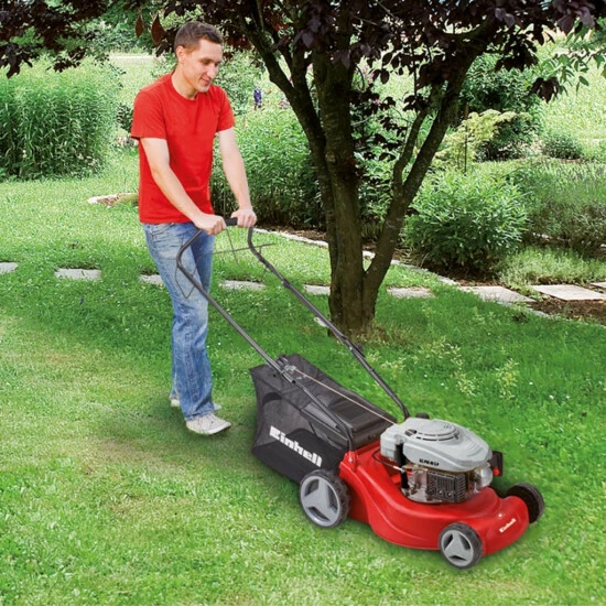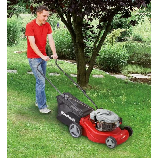 Der Einhell Benzinrasenmäher GC-PM 40 S-P verfügt über einen luftgekühlten OHV Einzylinder-Viertaktmotor und einen ergonomischen Klappgriff und ist deshalb leicht zu benutzen, weil es entworfen ist, um sich an Ihre Körperhaltung anzupassen! Mit einer Schnittbreite von 40 cm und einer verstellbaren Schnitthöhe mit 5 Einstellungen (zwischen 25 und 60 mm) ist er perfekt für große Rasenflächen und Flächen mit hohem Gras. Hinsichtlich des Designs ist der Einhell GC-PM 40 S-P mit einem Klappgriff für platzsparende Aufbewahrung ausgestattet und hat einen Grasauffangbeutel mit einer Kapazität von 50 Liter, was ihn zu einem idealen Benzinrasenmäher macht. Es weist wegen des robusten Kunststoffgehäuses einen klaren Gewichtsvorteil gegenüber Rasenmähern mit Stahlgehäuse aus.