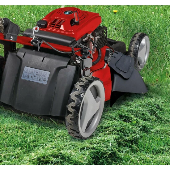 Der Benzin-Rasenmäher GC-PM 51/3 S HW-E ist ein robuster und sehr leistungsstarker Mäher, der sich beim Pflegen ausgedehnter Rasenflächen als zuverlässiger Helfer für jeden ambitionierten Hobbygärtner erweist. Sein kraftvoller luftgekühlter Einzylinder-Viertaktmotor liefert ein hohes Drehmoment, mit dem sich auch dichter, hoher Bewuchs zügig bearbeiten lässt. Besonders komfortabel lässt er sich durch die Elektro-Start-Funktion einfach und schnell starten. Das robuste Gehäuse besteht aus formschönem, pulverbeschichtetem Stahlblech. Dieser Mäher wird für Rasenflächen bis 1.800 m² empfohlen.