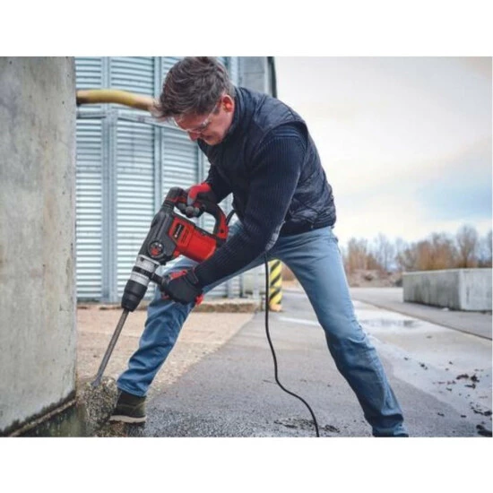 Der Einhell Bohrhammer TE-RH 40 3F ist ein 1.050 Watt starker Helfer mit drei Basis-Funktionen: Hammerbohren und Meißeln mit/ohne Fixierung. Mit dem pneumatischen Schlagwerk verfügt der Bohrhammer über einen sehr guten Vortrieb für bis zu 40 mm Bohrleistung in Beton. Der Bohrhammer ist ausgerüstet mit einer Dauerlaufarretierung, einer robusten SDS-max-Werkzeugaufnahme mit Halbautomatik und einer Drehzahl-Elektronik für material-/anwendungsgerechtes Arbeiten. Die Lieferung erfolgt inklusive Spitz- und Flachmeißel im Transport- und Aufbewahrungskoffer E-Box M55.