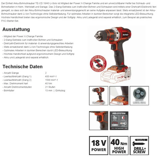 Einhell Akku-Bohrschrauber TE-CD 18/40 Li Power X-Change + Starter Kit 2.5 Ah