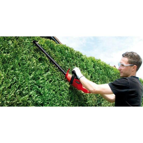 Die Einhell Elektro-Heckenschere GC-EH 5747 ist ein leistungsstarkes Gartengerät, um Hecken zu stutzen, zu formen oder auszudünnen. Für Sicherheit sorgt ein Zwei-Hand-Sicherheitsschalter, der die gegenläufigen, beidseitigen Sicherheitsmesser in weniger als einer Sekunde stoppt. Ein großflächiger Handschutz schützt die Hände vor gelösten Grünteilen. Ein Zusatzhandgriff sorgt für optimale Ergonomie und einen festen Halt. Die Elektro-Heckenschere vefügt zudem über ein widerstandsfähiges Metallgetriebe für hohe Lebensdauer. Eine Kabelzugentlastung ist ebenfalls vorhanden. In der Lieferung inklusive ist ein stabiler Köcher für die Lagerung und den Transport.