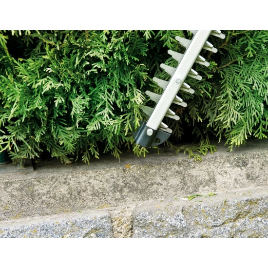 Die Elektro-Heckenschere GH-EH 4245 ist ein praktisches und zuverlässiges Gerät, das sich bei der Pflege von Hecken, Sträuchern und Gebüsch als unentbehrlicher Helfer erweist. Ihre gegenläufigen, beidseitig schneidenden Sicherheitsmesser aus lasergeschnittenem und diamantgeschliffenem Stahl erzielen sehr gute Schnittresultate. Für die effiziente Kraftübertragung sorgt ein robustes Metallgetriebe mit hoher Lebensdauer. Dank Zusatzhandgriff und niedrigem Gewicht lässt sich die Heckenschere mühelos führen. Der Zweihand-Sicherheitsschalter und der großflächige Handschutz der GH-EH 4245 sorgen für eine hohe Sicherheit während des Arbeitens. Die Messer werden durch eine Messerabdeckung aus Aluminium geschützt. Ein Zusatzhandgriff bietet hohe Ergonomie für komfortables Arbeiten. Das Zuleitungskabel ist durch eine Zugentlastung vor Beschädigung geschützt. Im stabilen Köcher lässt sich die Elektro-Heckenschere sicher transportieren.