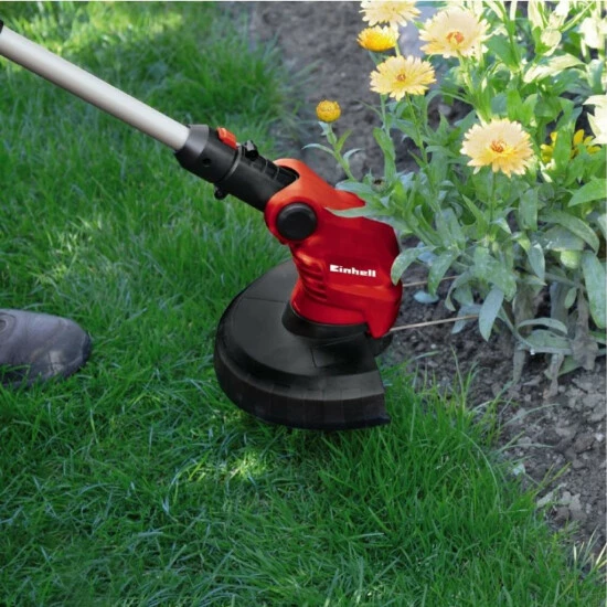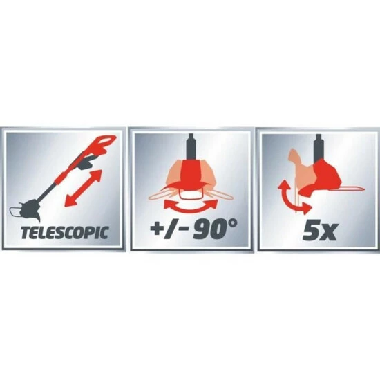 EINHELL Elektrische Trimmer – Leistung: 400 W – Stromversorgung: 230 V / 50 Hz – Schnittdurchmesser: 250 mm – Gewindelänge: 6 m – Gewindetyp: Nylon – Gewindedurchmesser: 1,6 mm – Drehzahl: 11000 U / min – Motorblock 5 Positionen einstellbar – Fadenvorschub durch Schläge – Schutzbügel – Teleskopgriff.