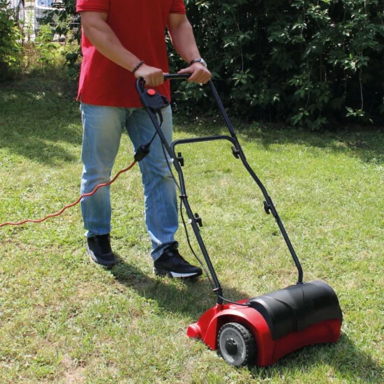 Dieser Elektro-Vertikutierer bearbeitet Bodenflächen bis ca. 300 m² fachgerecht, kraftvoll und zuverlässig und hilft so, gesunden Rasen zu erhalten. Auf der kugelgelagerten Messerwalze befinden sich acht hochwertige Doppelmesser, die Unkraut und Moos mitsamt der Wurzel entfernen. Die Arbeitstiefeneinstellung ist drei-stufig und verfügt über eine Parkposition. Für kontinuierlichen Arbeitsfortschritt sorgt der leistungsstarke Motor. Das Kunststoffgehäuse ist schlagzäh und damit besonders langlebig und die großen Räder schonen den Rasen.