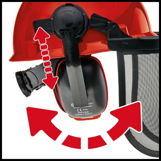 Mit dem Einhell Forstschutzhelm arbeiten wie ein Profi – immer auf der sicheren Seite. Der von Einhell konzipierte Forstschutzhelm lässt in vielen Situationen sinnvoll und professionell verwenden. Ob bei Arbeiten in Wald und Holz oder bei Schnittarbeiten mit der Motorsäge, die eigene Gesundheit steht dabei stets im Vordergrund. So lässt sich das Kopfband mittels eines ausgefeilten Einhandsystems komfortabel in der Länge verstellen. Der flexible Gesichtsschutz ist klappbar und verstellbar und bei gesicherten Arbeitsschritten auch abnehmbar. Geachtet wurde bei der Konzeption auch auf den optimalen Gehörschutz. Dieser ist drehbar, klappbar und in der Höhe stufenlos verstellbar, so dass er sich seinem jeweiligen Träger individuell anpasst.