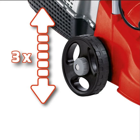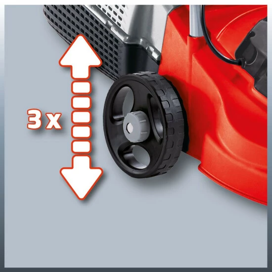 - Schnitthöhenverstellung: 3 Stufen / 25-60 mm / Einzelrad