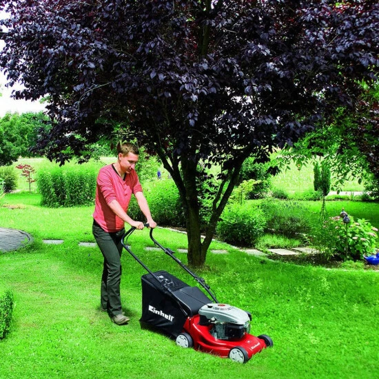 Der GH-PM 40 P RasenmĂ€her mit 4-Takt Benzinmotor wird per Startseilzug am FĂŒhrungsholm gestartet. Bei einer Motorleistung von 1,6 Kilowatt (2,2 PS) können wahlweise ca. 1,3 l Benzin oder E10-Kraftstoff getankt werden. Dank seines ergonomischen und klappbaren FĂŒhrungsholm, gelingt die Handhabung beim RasenmĂ€hen sehr viel komfortabler. Die Schnitthöhe wird am Einzelrad in drei Stufen eingestellt. Die Schnittbreite des RasenmĂ€hers betrĂ€gt dabei ca. 40 cm, die Deckbreite ca. 46 cm. Ein strapazierfĂ€higer Grasauffangsack aus Textil bietet ein FĂŒllvolumen von ca. 45 l.