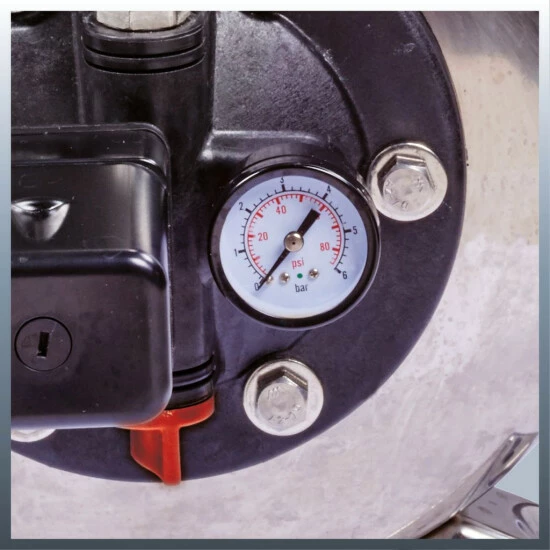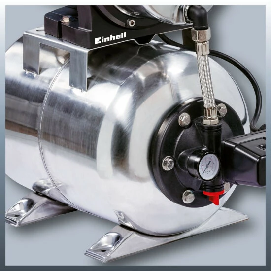 Das Einhell Hauswasserwerk GC-WW 1250 NN besteht aus einer Wasserwerk-Jet-Pumpe mit Ein-/Ausschalter und einem INOX EdelstahlPumpengehäuse. Mit seinem 1.200 W starken Motor fördert das Wasserwerk bis zu 5.000 Liter stündlich. Der wartungsfreie Elektromotor ist mit einem thermischen Überlastschutz ausgerüstet. Der Edelstahldruckkessel verfügt über ein Volumen von 20 l, ein Manometer ist integriert. Das Wasser wird durch den autom. Druckschalter mit konstantem Druck gehalten. Die Gleitringdichtung sorgt für eine lange Lebensdauer. Für einfache Inbetriebnahme ist eine separate Einfüllschraube installiert, eine Ablassschraube für eine bequeme Restwasserentleerung. Der Standfuß wird an den Bohrungen fixiert.