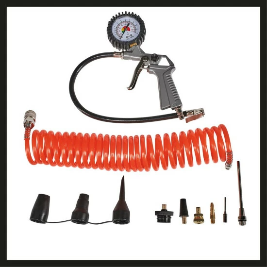- Inkl. Ausblaspistole, Reifenfüller, 5m Spiralschlauch & 8 Adapter