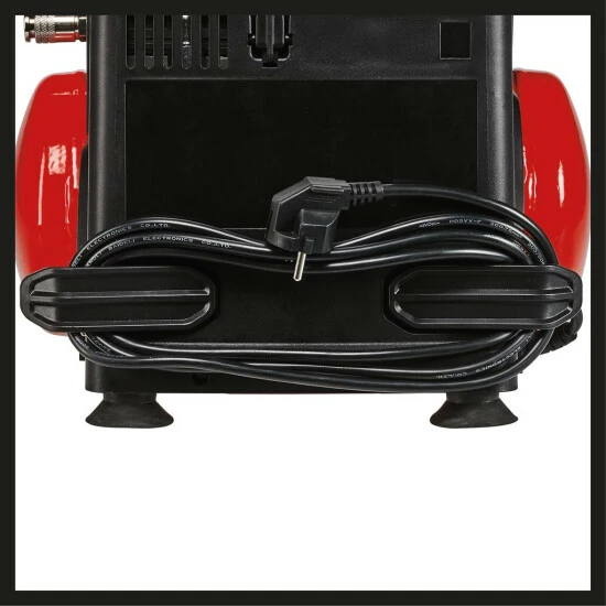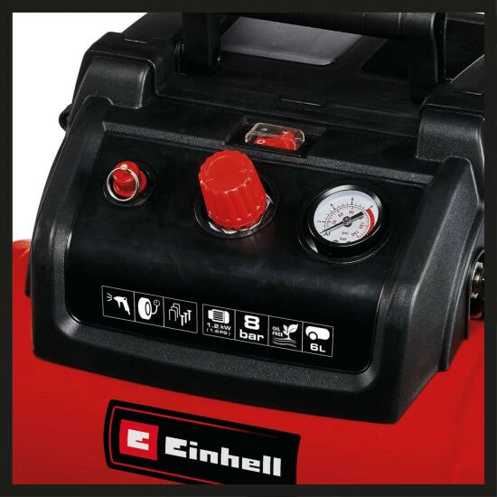 Der Einhell Kompressor TC-AC 190/6/8 OF Set ist ein echter Allrounder. Gering ist der Wartungsaufwand des öl- und servicefreien Motors. Der mobile Kompressor ist mit einem 6 Liter Drucklufttank, Kabelaufwicklung, Haken und Aufbewahrungsfach für Zubehör ausgestattet. Dank des bis zu 8 bar regulierbaren Druckminderers kann der Kompressor flexibel eingesetzt werden. Manometer und Schnellkupplung für den geregelten Arbeitsdruck sind vorhanden, Sicherheit bieten die Standfüße sowie das Sicherheitsventil. Die Entwässerungsschraube erlaubt eine komfortable Wartung. Zum Ausstattungsumfang gehören Ausblaspistole, Reifenfüller, ein 5 Meter langer Spiralschlauch und 8 Adapter.