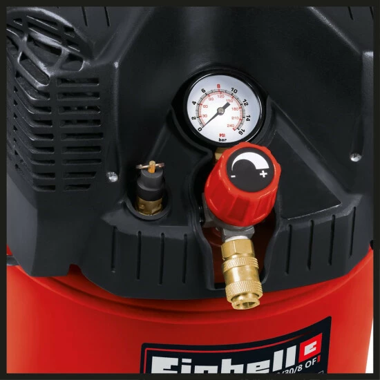 Der TC-AC 200/30/8 OF ist ein vielseitiger Kompressor, der mit seiner stehenden, platzsparenden Bauweise in keiner Werkstatt oder Garage fehlen darf. Der Arbeitsdruck kann mittels Druckminderer bis zu 8 bar reguliert werden und bietet bei einer Vielzahl von Druckluftarbeiten gute Dienste. Sein ölfreier Motor kommt ohne Schmierung aus und ist daher besonders wartungsarm sowie in jeder Position transportierbar. Der geregelte Arbeitsdruck des Kompressors wird per Manometer angezeigt und an der Schnellkupplung abgenommen. Für Mobilität und einen einfachen Transport sorgen der Haltebügel und die großen Räder. Das Ablassen des Kondensats aus dem Kessel per Entwässerungsschraube ermöglicht eine komfortable Wartung. Die vibrationsdämpfenden Standfüße vermeiden Erschütterungen und reduzieren die Geräuschentwicklung. Dank Rückschlag- sowie Sicherheitsventil ist für die Sicherheit des Bedieners bestens gesorgt.