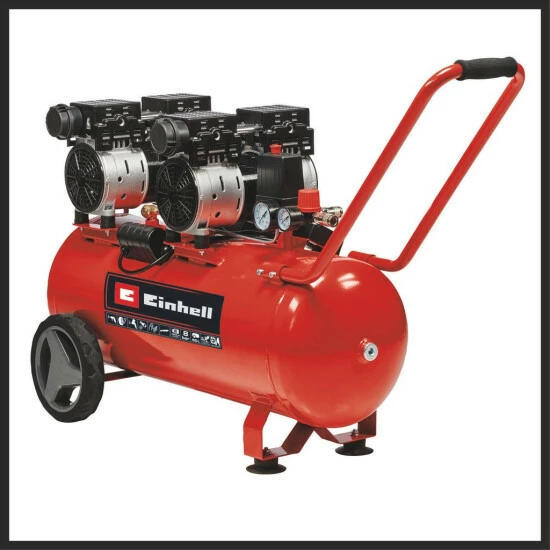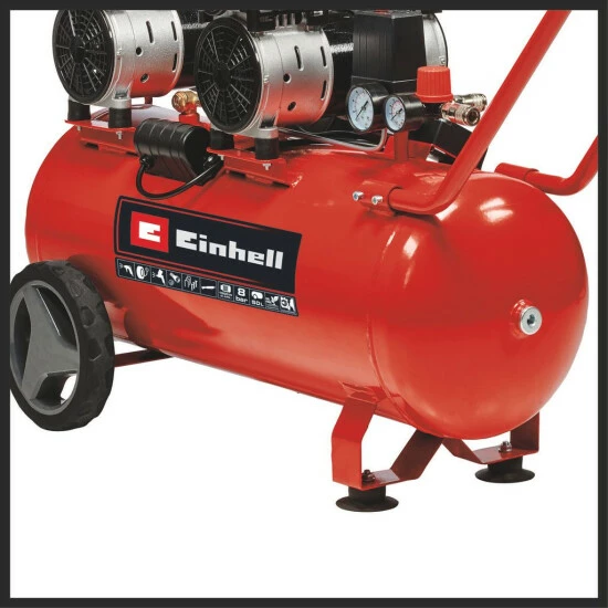 Der Einhell Kompressor TE-AC 50 Silent ist ein multifunktionaler Flüsterkompressor mit geringer Geräuschentwicklung und 1.500 Watt Leistung. Angetrieben wird er von einem öl- und servicefreien Motor, komfortabel zu warten durch die Entwässerungsschraube. Der 50 l-Tank bietet ausreichend Luftreserven, die Anwendungen sind bis zum Maximaldruck von 8 bar regulierbar. Je ein Manometer und eine Schnellkupplung für den geregelten Arbeitsdruck und für den ungeregelten Kesseldruck sind vorhanden, ein Sicherheitsventil sorgt für Anwendersicherheit. Große Räder und ein Transportbügel erleichtern den Transport. Die vibrationsdämpfenden Standfüße sorgen für einen sicheren Stand.