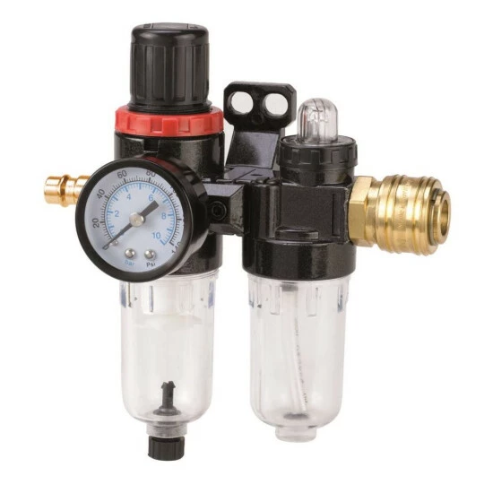 Bestehend aus Filter, Druckminderer, Druckminderer mit Manometer und Nebelöler.