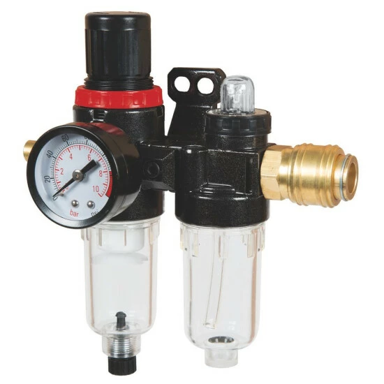 Einhell Kombiwartungseinheit + Öler / Zubehör Kompressor geeignet für die Druckminderung von Druckluft und das Ölen von Druckluft bestehend aus: Filter Druckminderer Druckminderer mit Manometer Nebelöler Technische Daten Gewindestecknippel R1/4 Schnellkupplung Eingangsdruck max. 10 bar regelbarer Druckbereich bis 8 bar