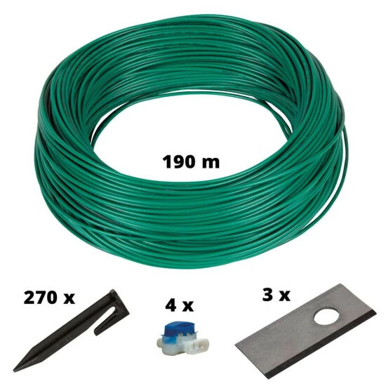 Dieses Kabel Kit beinhaltet alles was für die Installation eines Einhell Mähroboters aus der FREELEXO Serie benötigt wird. Der Power X-Change Akku muss separat erworben werden. Es ist ausgelegt für Rasenflächen bis zu 900 m². Im Lieferumfang sind 190 m Begrenzungsdraht, 270 Befestigungshaken, 3 Ersatzklingen und 4 Verbindungsklemmen enthalten.