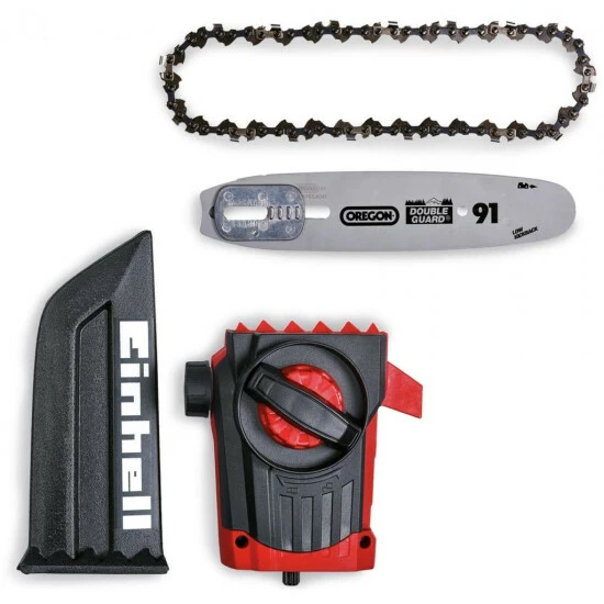 Einhell Akku-Hochentaster Aufsatz für GE-HH 18/45 Li T. Schnittgeschwindigkeit 3.76 m/s, ausgestattet mit OREGON-Qualitätsschwert und kette. Mit dem 90° drehbaren Aufsatz gelingen mühelos Horizontalschnitte. Der Kettenwechsel erfolgt werkzeuglos, die Kettenspannung kann ebenfalls ohne weiteres Werkzeug eingestellt werden.