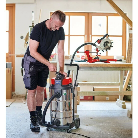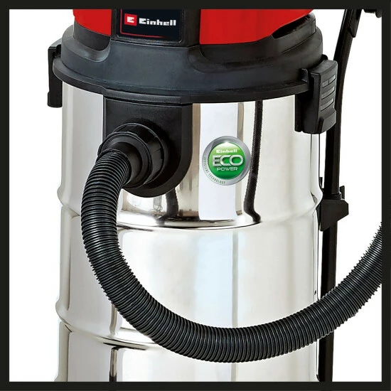 Der Einhell Nass-Trockensauger TE-VC 2340 SA reinigt im Gegensatz zu einem reinen Staubsauger und einem Wischmopp tief und gründlich. Damit ist ein Nass-Trockensauger die passende Ergänzung zu haushaltsüblichen Reinigungsgeräten bei starken, hartnäckigen und tiefen Verschmutzungen. Auch ambitionierten Heimwerkern ist ein Nass-Trockensauger bei Reinigungsaufgaben am Bau, in der Werkstatt oder im Hobbykeller ein praktischer Helfer. Das Innere aller Arten von Kraftfahrzeugen kann mit einem Nass-Trockensauger bis in die Textilspitzen gereinigt werden, Sitze und Himmel gleichermaßen wie die Teppiche und die Verkleidung. Der Einhell Nass-Trockensauger ist als ECO Staubsauger für hohe Saugleistung bei geringem Stromverbrauch konzipiert und setzt 1.200 Watt um. Der rostfreie Edelstahlbehälter fasst 40 Liter und ermöglicht damit ausdauernde Einsätze. Der Fehlluftregler ist einfach zu erreichen am Handgriff. Ein Blasanschluss zum Ausblasen von schwer zugänglichen Stellen ist integriert. Am Gehäuse integriert ist eine automatische Gerätesteckdose zum Betrieb von Elektrowerkzeugen. Ebenso vorhanden ist eine praktische Zubehörhalterung zum sauberen Verstauen des mitgelieferten Zubehörs. Das 500 Zentimeter lange Stromkabel kann am Trolley-Griff aufgewickelt werden. Eine einfache Reinigung des Nass-Trockensaugers gelingt durch die Wasserablassschraube zum Ablassen des aufgesaugten Wassers. Im Lieferumfang enthalten sind ein Teleskoprohr aus Edelstahl (Ø 36 mm), ein extra langer Plastiksaugschlauch (Ø 36 mm) mit 3 Metern Länge, eine große Kombidüse für Teppich- und Glattböden, Fugen- und Polsterdüse sowie Schaumstofffilter, Faltenfilter und Papierschmutzfangsack.