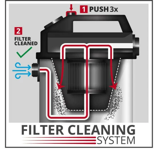 - Das Einhell Dual-Staub-Filtersystem besteht aus einem Faltenfilter und einem Feinstaubbeutel.