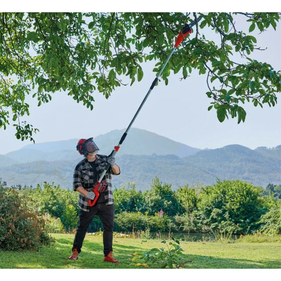 Der Einhell Akku-Hochentaster GC-LC 18/20 Li T-Solo ist ein Mitglied der Power X-Change-Familie. Die Lieferung erfolgt ohne Akku und Ladegerät, diese sind separat erhältlich. Der Hochentaster ist mit einem OREGON-Qualitätsschwert und –kette, einem Kettenfangbolzen sowie einem langlebigen Metallgetriebe und einem Krallenanschlag aus Metall ausgerüstet. Der Ölbehälter sorgt für die automatische Kettenschmierung. Der Motorkopf hat eine Neigung von 30°, zusammen mit der Verlängerungsstange ist der Hochentaster flexibel einsetzbar. Die zusätzliche gummierte Haltefläche eignet sich zum ergonomischen Arbeiten, zudem ist der Entaster mit einem Tragegurt ausgestattet.