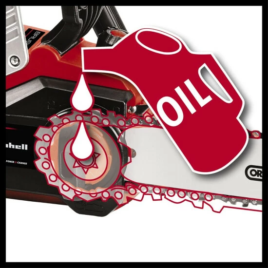 Die Einhell Akku-Kettensäge GP-LC 36/35 Li-Solo bietet Power und Flexibilität. Sie ist Mitglied der Power X-Change-Familie. Zwei 18 V-PXC-Akkus speisen den Einhell Brushless Motor, einen bürstenlosen Elektromotor, mit Energie. Durch das OREGON Qualitätsschwert und -kette arbeitet sie sich auch in größere Stämme. Kettenspannung und -wechsel erfolgen werkzeuglos. Durch den ergonomischen Softgrip liegt die Akku-Kettensäge sicher und angenehm in der Hand. Die Kettenschmierung erfolgt automatisch, es ist eine große Öleinfüllöffnung vorhanden. Akku und Ladegerät sind separat erhältlich.
