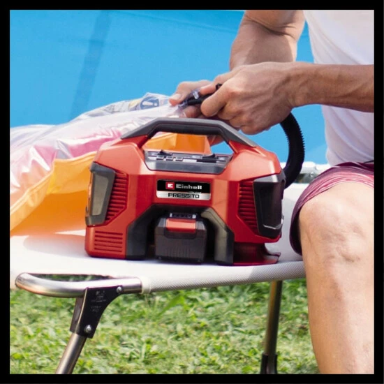 Dem Einhell Akku-Kompressor Pressito 18/21 geht die Luft nie aus. Ob Pumpen oder Entlüften, die Einsatzmöglichkeiten sind vielfältig. Der Kompressor ist Mitglied der Power X-Change-Familie: Der PXC-Akku lässt sich in allen Geräten der Systemfamilie verwenden. Dank seiner Hochdruckpumpe eignet sich der Kompressor zum Aufpumpen von Autoreifen, Radreifen und Bällen, seine Niederdruckpumpe dagegen zum Befüllen von Luftmatratzen, beim Niederdrucksaugen lassen sich diese wieder entlüften. Der Kompressor ist ausgestattet mit einer digitalen Druckanzeige mit einfacher manueller Bedienung, wählbare Einheiten für den Druck sind Bar, PSI und kPa. Der gewünschte Druck kann bei der Hochdruckpumpe eingestellt werden. Zu den praktischen Features gehören die Auto Shutoff-Funktion bei Erreichen des eingestellten Drucks und ein Tastschalter zum Aufpumpen im Hochdruckbereich ohne Druckvoreinstellung. Ausgestattet ist der Akku-Kompressor mit einem Aufbewahrungsfach für das 3-teilige Adapter-Set. Zum Betrieb wird ein 18 V-Akku benötigt. Die Lieferung erfolgt ohne Akku und Ladegerät. Diese sind separat erhältlich, zum Beispiel als praktisches Einhell-Starterset.