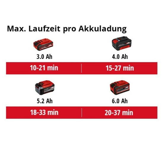 – Empfehlung für optimale Ergebnisse: 3,0Ah Akku und größer