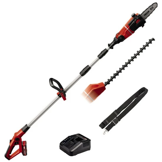 Das Akku-Multifunktionswerkzeug GE-HC 18 Li T Kit ist ein leistungsstarkes Gerät, mit dem sich höher gelegene Äste und hohe Hecken mühelos und stromnetzunabhängig vom Boden aus beschneiden lassen. Durch das Power X-Change Batteriesystem von Einhell verfügt das Multitool über einen 18 V Akku mit 3,0 Ah für ausgedehnte Arbeitseinsätze. Dabei sorgt das Qualitätsschwert und die Kette von OREGON für ein sauberes Schnittbild. Automatische Kettenschmierung und der werkzeuglose Kettenwechsel ermöglichen eine einfache Handhabung. Die lasergeschnittenen und diamantgeschliffenen Messer der Heckenschere sorgen für saubere Schnittresultate. Durch die verschiedenen Einstellmöglichkeiten kann das Multitool auf jede Arbeitssituation angepasst werden.