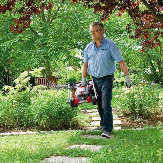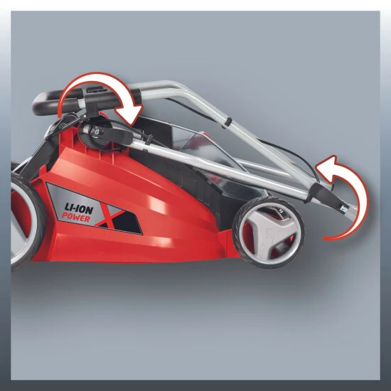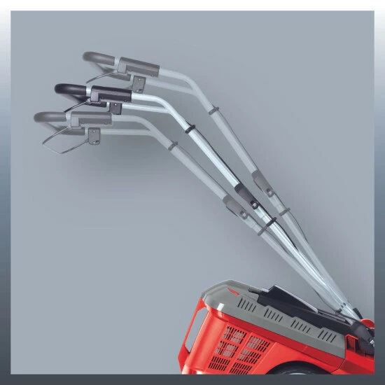 Der dreifach höhenverstellbare Führungsholm ermöglicht jedem Anwender die optimale Anpassung an die ergonomische Bedienung des Rasenmähers. Zudem kann er platzsparend eingeklappt und mit dem praktischen Tragegriff einfach verstaut werden.