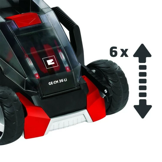 Der Akku-Rasenmäher GE-CM 36 Li M ist ein sehr hochwertiges, zuverlässiges und äußerst leistungsstarkes Gerät für die kabellose Pflege mittlerer Rasenflächen. Durch das neue Power X-Change Batteriesystem von Einhell verfügt der Rasenmäher über zwei starke 18 V Akkus mit 3,0 Ah, für ausgedehnte Einsätze ohne lästiges Stromkabel. Die sechsstufige zentrale Schnitthöhenverstellung erlaubt die einfache, individuelle Einstellung der Schnitthöhe.