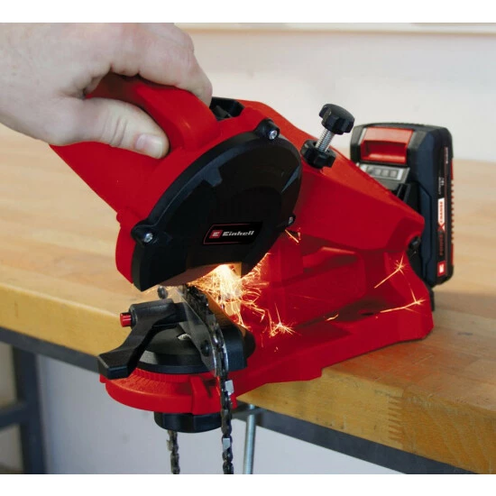 Das Einhell Akku-Sägekettenschärfgerät GE-CS 18 Li – Solo schärft die Kette und schont den Geldbeutel durch ein akkurates Nachschärfen statt einem teuren Neukauf. HandelsĂźbliche Ketten fĂźr Kettensägen lassen sich mit dem Sägekettenschleifgerät schnell und schonend schärfen. Die Tiefenbegrenzung sichert die Kette vor zu viel Materialverlust. Mit der Skala zur präzisen Schleifwinkeleinstellung und der Kettenspannvorrichtung gelingt das exakte Bearbeiten mittels der Schleifscheibe im Handumdrehen. Das Kettensägenschärfgerät wird ohne Akku und ohne Ladegerät geliefert, diese sind separat erhältlich.