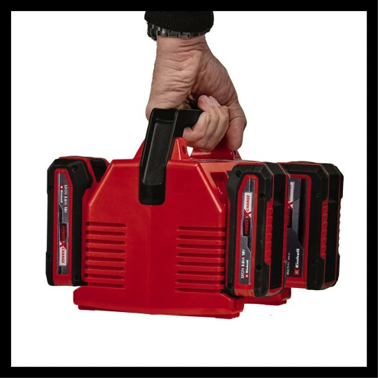 Mit dem Einhell 2×2 Power X-Quattrocharger 4A lassen sich 4 Akkus der Power X-Change Systemreihe noch schneller aufladen. Mit einem Akku und einem Ladegerät für alle Geräte spart der Kunde bei der Anschaffung erhebliche Kosten, die universelle Einsatzmöglichkeit schont die Umwelt und bietet dazu Flexibilität. Gleichzeitiges Laden von 2 Akkus bringt schnelle Verfügbarkeit. Der Tragegriff und das geringe Gewicht ermöglichen einen einfachen Transport von 4 Akkus. Das 4-A Schnellladegerät sorgt für noch kürzere Ladezeiten, einen opt. Ladevorgang und höchste Sicherheit dank intelligentem Lademanagement. Der Refresh-Modus sorgt für die Reaktivierung tiefenentladener Akkus. Informationen werden über die 6-fache LED-Anzeige je Akku bereitgestellt.