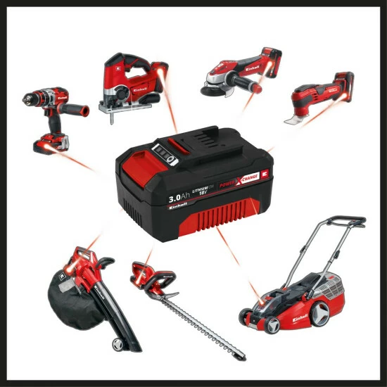 Original Einhell Starter Kit Akku und Ladegerät Power X-Change (Lithium Ionen, 18 V, 3,0 Ah Akku und Schnellladegerät, passend für alle Power X-Change Geräte)Das Einhell 18 Volt 3,0 Ah PXC Starter-Kit umfasst ein optimales Set der Power X-Change-Reihe für Heimwerker und Gartenfreunde. Das Set umfasst einen 3,0 Ah-Akku mit Ladegerät. Das Akkusystem ist universell für die Power X-Change-Serie verwendbar. Für maximale Sicherheit sorgen das proaktive Batterie- und intelligente Lademanagement. Durch situativ angepasste Ladezyklen wird der Akku optimal geladen und die Lebensdauer verlängert. Modernste Bauteile überwachen konstant alle Parameter. Die 3-Stufen-LED Ladestandskontrolle zeigt die Energiereserven des Akku. Im Ladezustand gibt das 6-Stufen-Ladesystem den aktuellen Ladezustand wieder. Das stoßsichere Gummigehäuse verfügt über Griffmulden. Das Set ist zur einfachen Wandmontage vorbereitet.Passend unter anderem zu folgenden Geräten und weiteren):Einhell: AXXIO , GE-LC 18 Li , TC-AG 18/115 Li , TC-CD 18-2 Li , TE-AG 18 , TE-AG 18 Li , TE-AG 18/115 Li , TE-AP 18 Li , TE-CD 18 Li , TE-CD 18/2 Li , TE-CD 18-2 Li , TE-CI 18 Li , TE-CS 18 Li , TE-CW 18Li , TE-HD 18 Li , TE-HD 18 Li , TE-JS 18 Li , TE-OS 18/1 Li , TE-RS 18 Li , TE-TK 18 Li