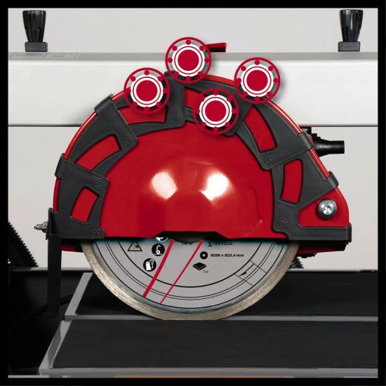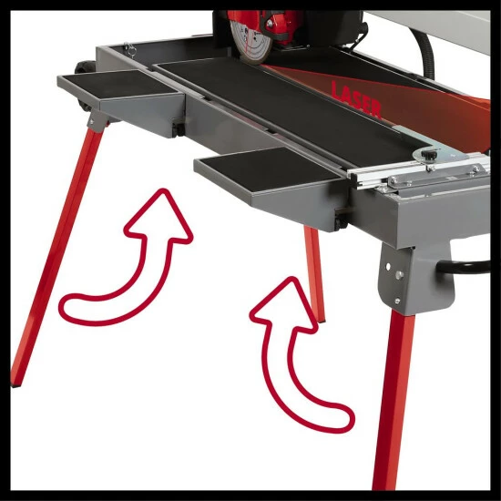 Die Einhell Radial-Fliesenschneidmaschine TE-TC 920 UL ist ein idealer Partner für Projekte rund um das Haus: Aus- und Umbauarbeiten, grundlegende Sanierungen oder Renovierung einzelner Räume oder auch für den Bestand im Hobbykeller oder Werkstatt für kreative Arbeiten. Ein Fliesenschneider ist bei Arbeiten um das Haus unentbehrlich: Geschnitten werden muss immer, ob die Wand- und Bodenfliesen im Bad oder der Küche, die Unterstellfläche des Ofens oder der Waschkeller bis hin zur Verfliesung des Heizkellers. Mit dem Radial-Fliesenschneider und materialangepassten Trennscheiben lassen sich Wand- und Bodenfliesen bis hin zu durchgebranntem Feinsteinzeug mühelos, exakt und staubfrei zuschneiden. Die Radial-Fliesenschneidmaschine von Einhell verfügt über extra lange Schnittlängen für moderne Großformate. Ein Laser dient der optischen Schnitthilfe. Die sechsfach kugelgelagerte Motorführung bietet einen gleichmäßigen Schnitt. Für eine exakte Kantenführung sorgt der gradgenau einstellbare Winkelanschlag als stabile Führung für Gehrungs- und auch Doppelgehrungsschnitte. Der Motor ist bis zu 45° Grad schwenkbar und bereits mit einer Turbo-Diamant Trennscheibe mit Wasserzuführung ausgerüstet. Die Wasserpumpe mit Schmutzfangkäfig und auswaschbaren Filtermatten hält größere Splitter und feste Verunreinigungen von der Pumpe fern. Zusätzlich werden feine Metallteilchen von der integrierten Filterung herausgelöst, so dass die Pumpe auch davon geschützt bleibt. Die massive Wasserauffangwanne ist aus Stahlblech gefertigt. Die Fliesenschneidemaschine ist auf einem robusten, einklappbaren Untergestell mit Einrastfunktion aufgebaut. Der höhenverstellbare Fuß lässt sich auf eine bequeme Arbeitshöhe anpassen. Der große Arbeitstisch mit rutschfester Gummiauflage allein bietet eine angemessene Arbeitsfläche für kleinere Projekte. Für größere Flächenbearbeitungen sind zudem zwei zusätzliche Arbeitische zur Verbreiterung des Arbeitstisches im Umfang. Die robusten Transporträder und der Transportgriff ermöglichen eine einfache Verschiebung des Schnittbereiches.