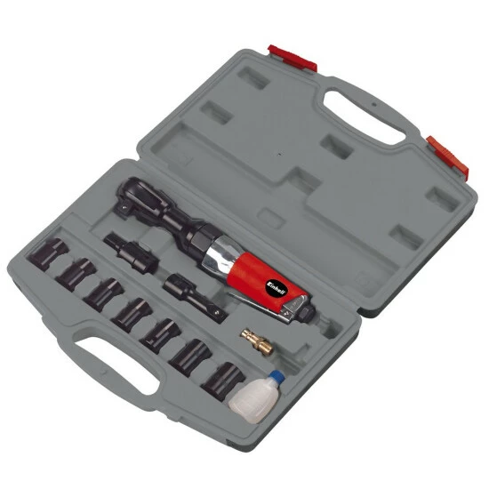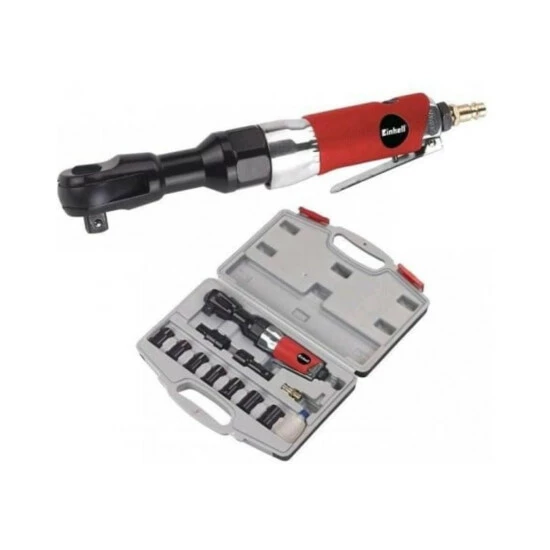 Einhell DRS 200/2 Ratschenschrauber (Pneumatic) | Hersteller-Nr.: 4139170 | EAN: 4006825504385 | Produkttyp: Druckluftzubehoer | Der Druckluft-Ratschenschrauber DRS 200/2 ist ein leistungsstarker Helfer bei einer Vielzahl von Schraubaufgaben rund um Haus. Werkstatt und Garage. Mit einem maximalen Betriebsdruck von 6.3 bar. einem kräftigen Lösedrehmoment und hochwertigem Zubehör ist der Ratschenschrauber das Gerät für den harten Einsatz. Dank neunteiligem Steckschlüssel-Set (SW: 9; 10; 11; 13; 14; 17; 19mm) ist das Gerät sofort startklar. | Kategorie: Drucklufttechnik > Druckluftzubehoer