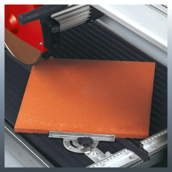 Die Steintrennmaschine TE-SC 570 L ist ein zuverlässiges und hochwertiges Gerät, mit dem sich Platten aus Stein und Beton, Ziegeln sowie Fliesen schnell und exakt zuschneiden lassen. Ihr robuster Motor stellt mit 1500 Watt genügend Leistung zur Verfügung, um die Turbo-Diamant-Trennscheibe mit 250 mm Durchmesser zügig durch harte Materialien wie Granit und Marmor zu treiben Die TE-SC 570 L verfügt über einen von 0° bis 45° stufenlos schwenkbaren Motorkopf mit vierfach kugelgelagerter Motorführung sowie eine Zuglänge von 570 mm. Dank verwindungssteifem, gradgenau einstellbarem Alu-Winkelanschlag lassen sich Gehrungs-, Doppelgehrungs- oder Jollyschnitte mit wenigen Handgriffen ausführen. Die bewegliche Lagerung des Motorkopfes ermöglicht darüber hinaus die Ausführung von Tauchschnitten. Der große Arbeitstisch mit rutschfester Gummiauflage ruht auf einem robusten Untergestell. Ihr abnehmbarer Laser erleichtert das präzise Arbeiten, indem er die Trennlinie exakt auf dem Werkstück markiert. Das Wasser zur Kühlung der Trennscheibe fördert die Maschine mittels integrierter Wasserpumpe aus der massiven Wasserauffangwanne aus Stahlblech.