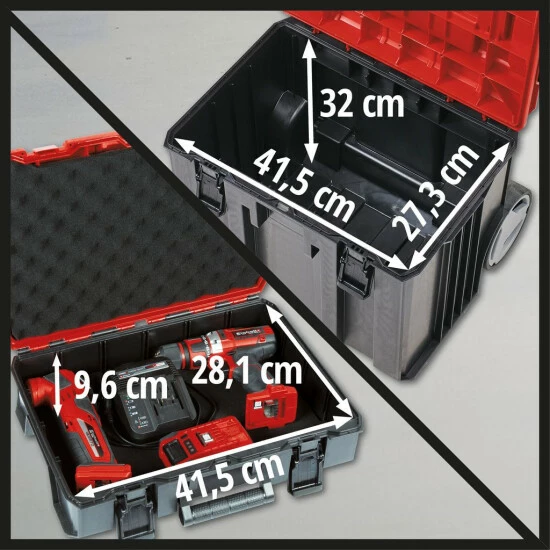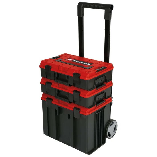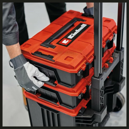 Der Einhell E-Case Tower ist Mitglied im modularen E-Case System von Einhell. Dieser zeichnet sich aus durch die Aufbewahrung und den Transport von Maschinen und Werkzeug. Ein praktisches Verriegelungssystem für die Verbindung gestapelter Koffer sorgt bei der Lagerung für systematische und sichere Ordnung beim Transport. Der Koffer ist aus Polypropylen gefertigt und weißt damit eine hohe Steifigkeit, Hitzebeständigkeit und Schlagresistenz auf. Die stabile Konstruktion erlaubt eine Gesamtnutzlast von bis zu 120 kg. Maschinen und Werkzeug können einfach transportiert werden, dank dem teleskopierbaren und extrabreiten Griff. Die großen Räder bringen ein angenehmes Rollverhalten, auf jedem Untergrund mit sich. Der Koffer ist dank dem intelligenten Design spritzwassergeschützt und kann bei jedem Wetter transportiert werden. Ein einklappbarer und ergonomischer Handgriff sorgt für einen optimalen Tragekomfort, beispielsweise beim Herausnehmen aus einem Kofferraum. Der E-Case kann mit einem Vorhängeschloss ausgestattet werden, um gegen einen Diebstahl gesichert zu sein. Der E-Case L beinhaltet eine herausnehmbare Einlage für Handwerkzeug. Einer der beiden E-Case S wird mit zwei Schaumstoffeinlagen für verkratzungsfreien Transport geliefert, der andere E-Case S beinhaltet ein Abtrenner-Set, um Kleinteile und Zubehör geordnet transportieren zu können. Zudem werden 3x Beschriftungsaukleber mitgeliefert – um immer zu wissen, was im Koffer ist.