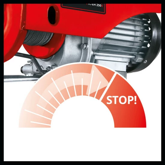 Der Seilhebezug TC-EH 250 ermöglicht rund um Haus, Garten und Werkstatt das sichere Heben von Lasten auf einfachen Schalterdruck. Seine umfangreiche Ausstattung entspricht dem neuesten Stand der Technik. Er ist mit 12 Metern Drahtseil mit einem Querschnitt von 3 mm ausgestattet. Damit hebt er Lasten bis 250 kg mittels Umlenkrolle mit Lasthaken auf eine Höhe von 5,7 m. Ohne Umlenkrolle halbiert sich die Maximallast, während sich die Hubhöhe auf 11,5 m erhöht. Der TC-EH 250 ist mit zahlreichen Sicherheitseinrichtungen ausgestattet. Sein schutzisolierter Bedienschalter verfügt über eine Not-Aus-Funktion, die per Tastendruck für sofortige Abschaltung sorgt. Der robuste Motor ist durch einen Thermoschalter vor Überhitzung geschützt. Das drallfreie Drahtseil verhindert das Verdrehen der Last beim Anheben. Ein Sicherheitsbügel am Lasthaken verhindert das unbeabsichtigte Herabfallen der Last, die in jeder Lage durch eine automatische Bremse gesichert ist. Für die Befestigung des Seilhebezugs sind zwei Doppelschellen vorgesehen. Für den BT-EH 250 ist separat ein passender Schwenkarm erhältlich, der das Schwenken von Lasten wie z. B. beim Anheben auf höherliegende Ebenen und Stockwerke ermöglicht.
