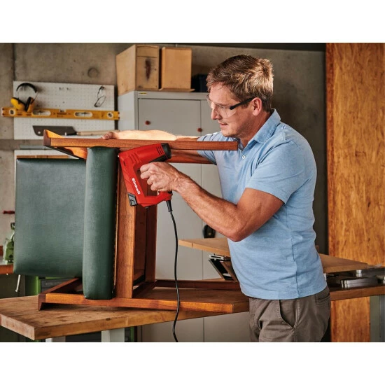 Der Elektrotacker TC-EN 20 E ist ein funktionaler Alleskönner im Haus, in der Werkstatt oder der Bastelstube. Das Verwendungsspektrum ist breit: Im Haushalt lassen sich mit dem Einhell Elektrotacker Papierstapel binden, Sitzflächen neu beziehen, Textilien befestigen oder kleinere Reparaturen erledigen. In der Hand eines Hobby-Heimwerkers eignet sich der Elektrotacker ideal für kleine und große Projekte: Gitter kleiner Ställe lassen sich problemlos fixieren, auch Folien oder Isoliermaterial können einfach befestigt werden. Eine elektronische Schlagkraftvorwahl sorgt für optimale Arbeitsergebnisse. Die Sicherheitsnase schützt vor Unfällen: Klammer- und Nagelauslösung funktionieren nur in Arbeitsstellung. Die Magazin-Füllstandsanzeige ist gut sichtbar angebracht. Bei langwierigen und intensiven Projekten beugt der ergonomische Handgriff dem Kräfteverfall vor und sorgt für ein angenehmes, ermüdungsfreies Arbeiten. Einen sicheren und komfortablen Halt hat der Anwender in jeder Lage durch den Softgrip. Die Lieferung umfasst 1000 Klammern und 500 Nägel.