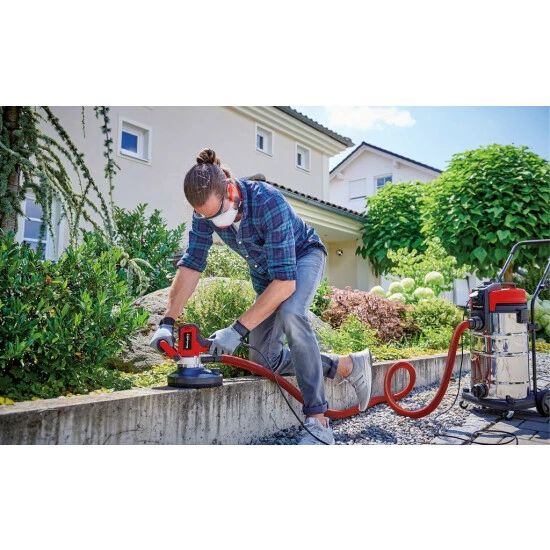 Mit dem Einhell Wandbearbeitungssystem TE-DW 180 ist der Heimwerker bestens gerüstet für Sanierungs-, Renovierungs- und Ausbauarbeiten. Die ergonomische Bauweise sorgt für angenehmes Arbeiten. Der verstellbare Zusatzhandgriff erlaubt eine optimale Handhabung, so dass die Arbeiten möglichst ermüdungsfrei und angenehm vonstatten gehen. Zudem bietet er bei allen Arbeiten einen festen, sicheren Halt und maximale Handlichkeit. Auf den jeweiligen Arbeitsschritt stellt sich die sechsstufige Drehzahlregulierung ein und erlaubt anwendungsgerechtes Arbeiten. Dabei ist das Einhell Wandbearbeitungssystem TE-DW 180 ein Allrounder und für jede Situation bestens gerüstet. Der Bürstenkranz mit abnehmbarer Kante ermöglicht randnahes Arbeiten. Die Schleifteller sind wechselbar für eine oberflächengerechte Anwendung. Der Mikroklett-Schleifteller ist für die Bearbeitung von Trockenbau konzipiert. Der Diamantschleiftopf kommt bei Beton, Granit, Estrich und Fliesenkleber zum Einsatz. Die Stahlbürsten im Lieferumfang beseitigen Tapetenreste und machen auch vor Beton nicht halt. Zum Lieferumfang gehören auch sechs Schleifscheiben im Durchmesser 180 mm (2*P60/2*P80/2*P120), so dass dem sofortigen Einsatz nichts mehr im Wege steht.