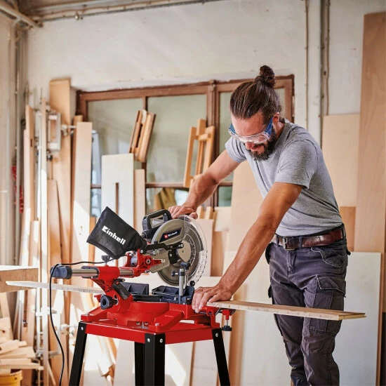 Die Einhell Zug-, Kapp-/Gehrungssäge TC-SM 2532/1 U ist ein hochwertiges Gerät für den ambitionierten Heimwerker. Sie ermöglicht die Bearbeitung von Holz, beschichteten Paneelen und Kunststoffen. Der Kappsägen-Drehtisch aus hochwertigem Aluminiumdruckguss verfügt über eine präzise Winkeleinstellung, die sich mit einem Handgriff in verschiedenen Positionen rasten lässt. Mit ihrem stufenlos nach links neigbaren Sägekopf ermöglicht die Säge die Anbringung von Gehrungen und Fasen in jedem gewünschten Winkel bis zu 45°. Die doppelt gelagerte Zugfunktion erlaubt das Schneiden besonders breiter Werkstücke. Für die sichere Fixierung des Werkstücks ist eine robuste Spannvorrichtung vorhanden. Dank Schnitttiefenregulierung lassen sich auch anspruchsvolle Arbeiten mühelos ausführen. Das standfeste Sägeblatt mit 254 mm Durchmesser sägt kraftvoll und sauber. Mittels Spindelarretierung lässt es sich bequem wechseln. Für Sauberkeit am Arbeitsplatz sorgt der Staubfangsack. Dank des Untergestells ist für eine entspannte Körperhaltung gesorgt. Für den einfachen, sicheren Transport ist eine Transportsicherung vorhanden.