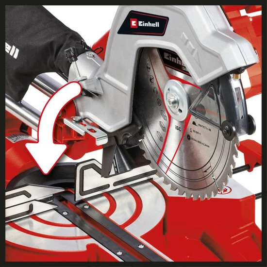 Mit der Einhell Zug-Kapp-Gehrungssäge TC-SM 254 ist der ambitionierte Heimwerker bestens gerüstet für Säge- und Kapp-Aufgaben, die in Heim, Werkstatt und Garage anfallen. Mit leistungsstarken 1.900 Watt arbeitet sich das Sägeblatt (Ø254 außen x ø30 innen) durch das Material. Dabei hat die stabile Säge eine leichtgängige Zugfunktion für breite Werkstücke. Die präzise Winkeleinstellung am Drehtisch erleichtert gelungene Schrägschnitte. Für die gebräuchlichsten Winkel bei Do-It-Yourself-Arbeiten sind im Drehtisch schon Einrastpositionen vorgesehen um die Winkel schnell und sicher einzustellen, was auch die clevere Schnellverstellung erleichtert. Der Anwender findet gut ablesbare Skalen für Winkel und Breiten vor. Der Sägekopf ist zudem nach links für Gehrungsschnitte neigbar. Die Schnittbreite beträgt bis zu 305 Millimeter bei einer 90°-Stellung und bis zu 210 Millimeter bei 45°, die Schnitthöhe bis zu 85 mm. Dabei erleichtert der gut sichtbare integrierte Schnittlinienlaser die Arbeiten ungemein. Jeweils links und rechts sind Auflagen für längere Werkstücke vorgesehen und damit die Werkstücke fixiert werden können, gibt es eine praktische Spannvorrichtung. Das hochwertige Hartmetall-Sägeblatt liefert ein perfektes Schnittbild. Durch den Spindle-Lock und die gut ereichbare Sägeblattschraube wird der Sägeblattwechsel erleichtert. Zur verbesserten Sägemehlabfuhr befindet sich hinter dem Sägeblatt ein Staubfangtrichter. Der vorhandene Absauganschluss hat einen Durchmesser von 36 Millimeter, alternativ kann der beiliegende Staubfangsack verwendet werden.