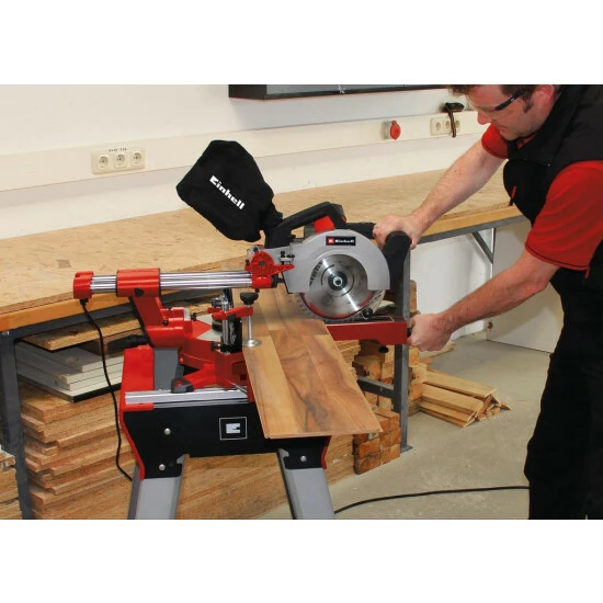 Die Einhell Zug-Kapp-Gehrungssäge TE-SM 2534 Dual ist bestens geeignet für viele Arbeiten. Eine leichtgängige Zugfunktion ermöglicht bequemes Ablängen auch von breiteren Werkstücken. Der Drehtisch hat eine präzise Winkeleinstellung mit Einrastpositionen für die gebräuchlichsten Winkel. Der Sägekopf ist zudem nach links und rechts für exakte Gehrungsschnitte neigbar. Schnittlinienlaser und integrierte LED-Beleuchtung erleichtern die Arbeit enorm, ebenso sind Spindle-Lock und Sägeblattschraube leicht erreichbar für einen einfachen Sägeblattwechsel. Die Auflagefläche kann links und rechts mit den X-Tend Seitentischen bequem mit einer Hand vergrößert werden. Ein weiteres Highlight ist der Softstart, der Ihre Sicherungen und den Motor schont.
